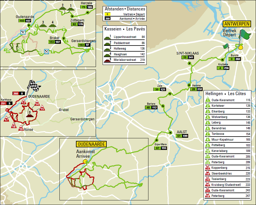 Así pues, la prueba comenzará en la mencionada localidad de Amberes, capital de la provincia homónima, siguiendo una ruta casi siempre en dirección suroeste durante los primeros 100 km, en busca del primer paso por Oudenaarde, ya en la provincia de Flandes Oriental, con los sectores de pavé llanos de Lippenhovestraat y Paddestraat como dificultades más reseñables, aunque como siempre ojo también a las posibles caídas y montoneras en zonas aparentemente más sencillas, que en anteriores ediciones ya afectaron a varios de los favoritos.