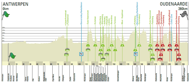 En definitiva, un recorrido de gran fondo, con más de 260 km y multitud de cotas y tramos de pavé, que además se concentran en la 2ª mitad de la prueba, con los 18 muros en los últimos 145 km de la ruta. Y al igual que en los últimos años tiene el acierto de no ser tan repetitivo como en 2012-2013, al no hacer dos bucles seguidos con Hotond-Kwaremont-Paterberg, acercando en su lugar el Koppenberg a meta e incluyendo también el Taaienberg en esa parte final. Por otro lado, gran noticia la recuperación del Kapelmuur, aunque eso sí, colocado muy lejos de meta, con un tramo posterior sin grandes dificultades antes de que llegue la parte a priori decisiva de la prueba.