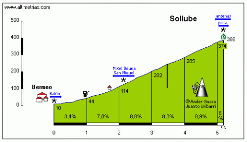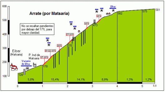 Usartza por Matsaria, con 2 km centrales al 15%. Tras coronar hay un km de bajada Arrate. Perfil Josemi Ochoa, click para descripción y fotos