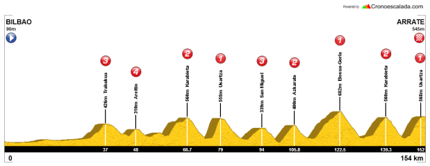 Como despedida de la prueba, la tradicional crono final, en este caso con trazado mixto de 27 km en torno a Eibar, incluyendo de salida el ascenso a Karabieta, con 4 km centrales al 7-8%, para tras su descenso por Elgeta encarar los últimos 16 km de etapa, básicamente llanos a excepción del pequeño repecho de Soraluze, siendo una contrarreloj para corredores completos y que salvo que la general llegue muy definida resultará clave para el podio final. Si bien el año pasado la CRI también se disputó en Eibar, con triunfo de Contador, por kilometraje y tipo de puerto se parece más a Markina 2014 (incluía 2 ascensiones, aunque más cortas), con victoria de Tony Martin por delante de Contador y de Kwiatkowski.