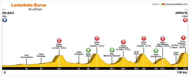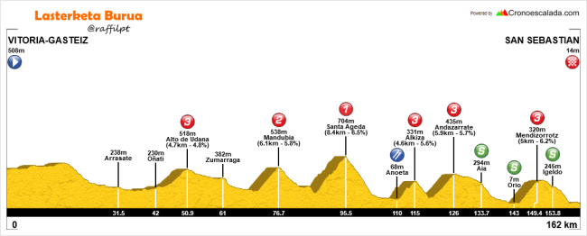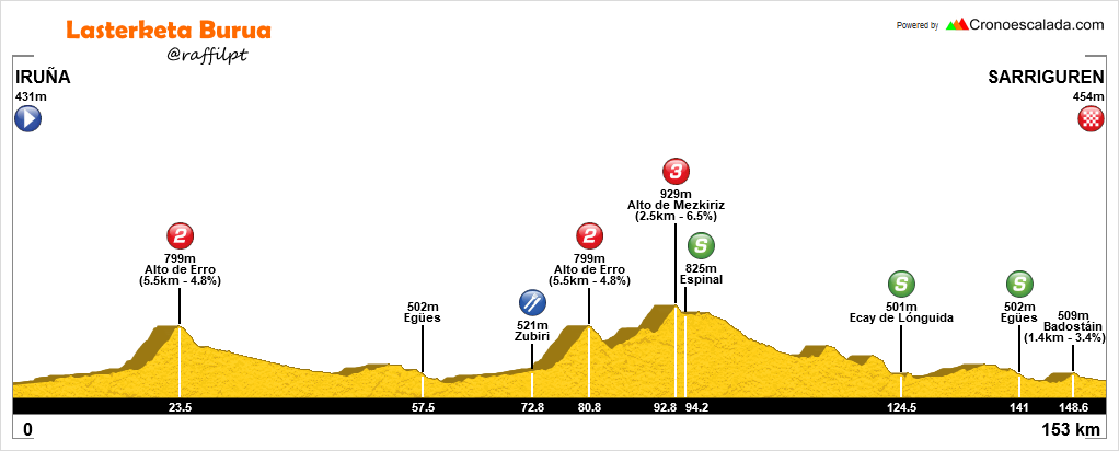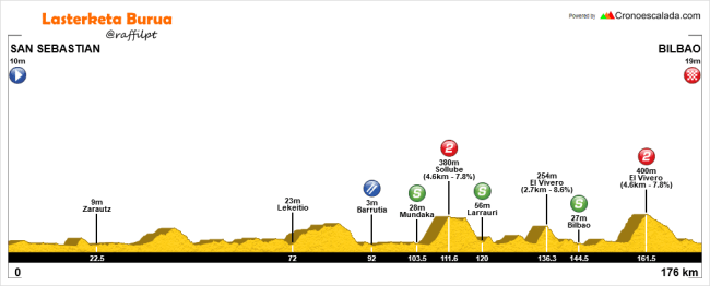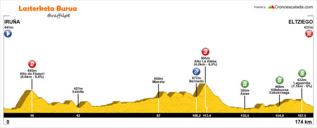Aclarar que los perfiles de etapa que hay a continuación no son los oficiales, sino que están hechos por @raffilpt (con el editor de perfiles Cronoescalada), uno de los colaboradores de Lasterketa Burua. Las categorías de los puertos sí son las adjudicadas por la organización, aunque hay varios casos donde resultan discutibles, tanto por exceso como por defecto, si bien son más realistas que otros años.