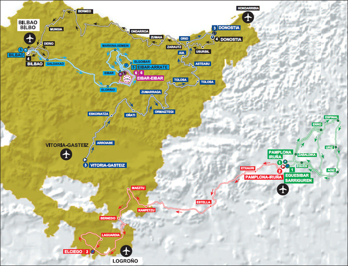 Así pues, la carrera comenzará en Navarra, con una etapa de 150 km que incluye varios bucles entre su capital, Iruña (Pamplona), y el municipio cercano de Valle de Egües, con un doble paso por el Alto de Erro, con 5 km al 5%, como mayor dificultad orográfica, en la 2ª ocasión encadenado con Mezkiriz, aunque muy lejos de la meta en Sarriguren, siendo un día propicio para los sprinters. La 2ª jornada unirá Pamplona con Elciego, en la Rioja Alavesa, teniendo que superar Etxauri de salida, con 6,5 km al 6-7%, y La Aldea por Bernedo, con 4 km de similar pendiente, a mitad de la ruta, para ya en la parte final realizar un circuito de 25 km en torno a Eltziego con varios repechos, el último Laguardia a 7 km de meta, dando opciones tanto a los velocistas como a los clasicómanos.