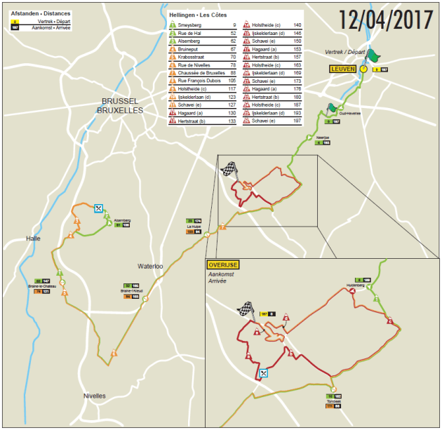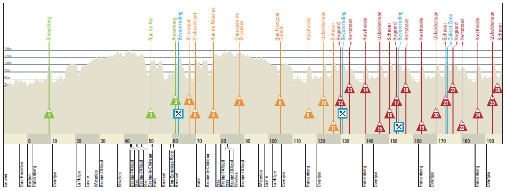Salvo por el muro de Smeysberg, novedad este año, los primeros 50 km de la carrera, casi siempre en dirección suroeste, son básicamente llanos, pero tras el paso por el municipio de Nivelles el recorrido se complica, teniendo que superar 25 cotas durante los últimos 150 km, aunque varias de ellas repetidas en múltiples pasos, habiendo en realidad “sólo” 13 cotas distintas. En general no son muy duras, si bien alguna cuenta con la superficie adoquinada (Herstraat), pero su acumulación provoca que sea una prueba exigente y muy difícil de controlar, resultando habitualmente muy entretenida.