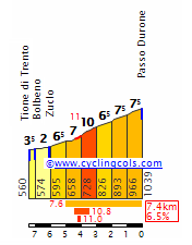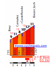 Forcella di Brez, con 6 km al 10%. Perfil de Cyclingcols