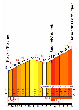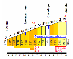 El ascenso a Mendola, muy regular al 6-7%. Perfil de la Gazzetta