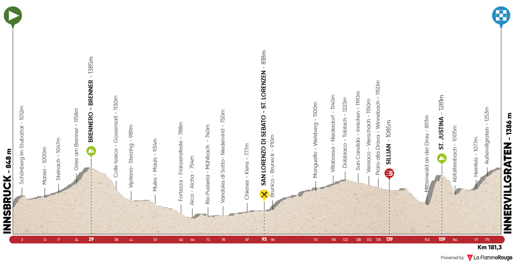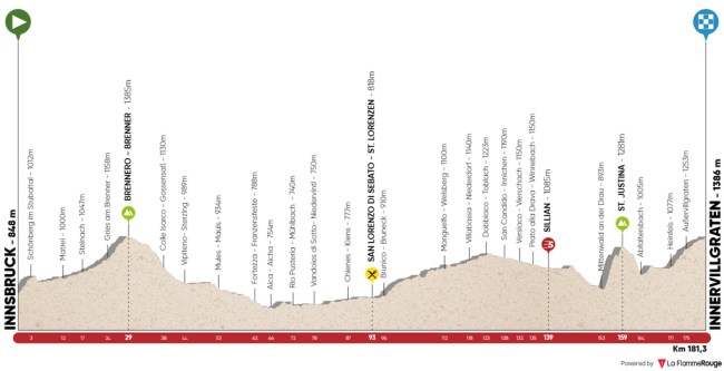 De este modo, la prueba se inicia con una etapa quebrada entre las localidades de Kufstein e Innsbruck, en el Tirol austríaco, teniendo que superar a mitad de la ruta Brandenberg, con 4 km iniciales al 9%, y el muro de Aschau, con 1,5 km al 10%, y ya en el último tramo Schlogelsbach / Mairbach, incomprensiblemente no puntuado pese a sus 3 km al 9-10%, y la subida final a Hungerberg, con 3,5 km al 7,5%, siendo favorable para los escaladores explosivos. Al día siguiente, nueva jornada de media montaña, con el puerto del Brennero, frontera entre Austria e Italia, dando paso a un terreno más sencillo hasta los últimos 30 km, cuando ya de nuevo en Austria la ruta se complique con Sankt Justina, con 4,5 km al 8,5%, precediendo al suave ascenso final a Inervillgraten, con varios km al 4% antes de convertirse en un falso llano, si bien justo antes de meta hay medio km al 5%, por lo que quién quiera romper el grupo tendrá que moverse en St. Justina.