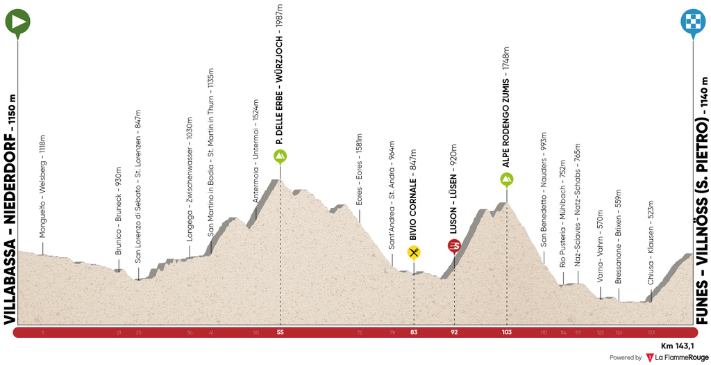 3ª ETAPA (Miércoles 19 Abril):  VILLABASSA / NIEDERDORF – FUNNES / VILLNÖSS  (143,1 km).  Info en la webRutómetro