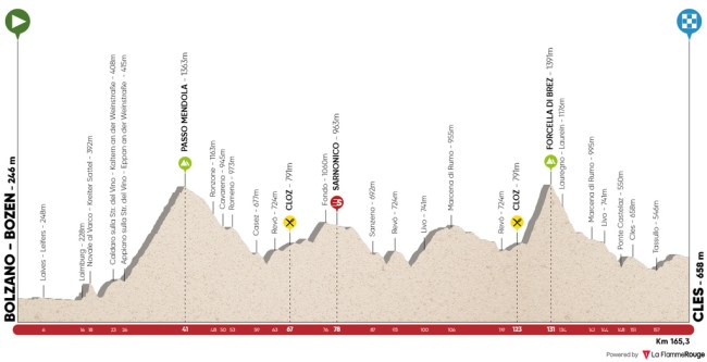 4ª ETAPA (Jueves 20 Abril):  BOLZANO – CLES  (165,3 km).  Info en la webRutómetro