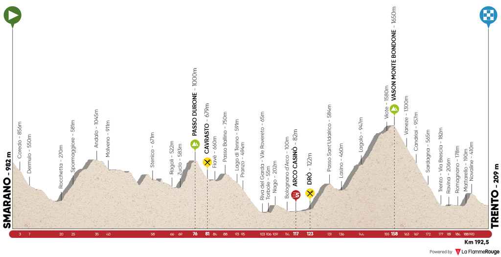 5ª ETAPA (Viernes 21 Abril):  SMARANO – TRENTO  (192,5 km).  Info en la webRutómetro