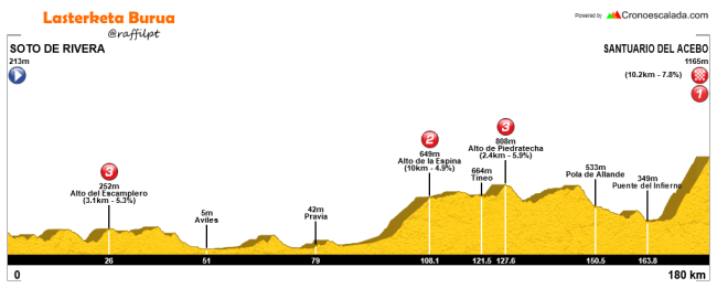 Al día siguiente, turno para la etapa reina, con casi 180 km entre Soto de Ribera y el Santuario del Acebo, el puerto emblemático de la Vuelta a Asturias y que volvió a incluirse en la pasada edición después de varios años de ausencia. La 1ª parte del recorrido, con travesía incluída por Avilés, es bastante «rompepiernas» aunque sin grandes puertos, para tras el paso por Salas afrontar el encadenado de La Espina, una subida larga pero sin grandes rampas, Piedratecha y Chavadoira, aunque este último no puntúa, para tras su descenso afrontar el repecho del Puelu y el paso por Cangas del Narcea, inicio de la subida final al Acebo, que con 9,5 km al 8,2% de media puede hacer mucho daño a poco que haya buen ritmo, incluyendo largos tramos al 10% y máximas del 16%, siendo clave para la general, aunque si las diferencias son pequeñas habrá opciones de remontada en la etapa siguiente.