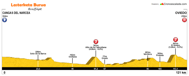 Y como despedida de la prueba, una etapa muy corta, con poco más de 120 km entre Corias, en Cangas de Narcea, y la ciudad de Oviedo, teniendo que superar a mitad de la ruta el Alto de la Cabruñana, con 5 km al 6,5%, y ya en la parte final, tras la meta volante de Posada de Llanera y el paso por Brañes, el ascenso conocido como El Violeo, con 2 km durísimos, al 12% de media y con puntas del 23%, antes de suavizar en el tramo final, coronándose oficialmente a 7 km de la llegada, con un irregular descenso que además de algún tramo bastante peligroso, con una carretera muy estrecha, incluye varios repechos antes de llegar a la meta en Oviedo, que estará de nuevo situada en la Calle Uría.