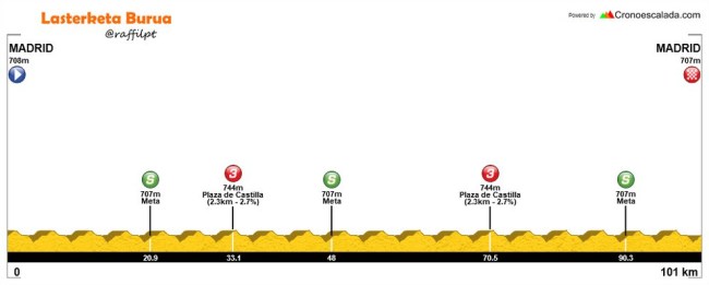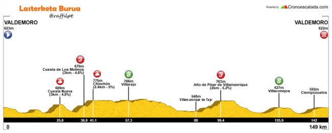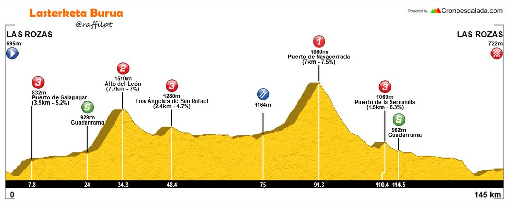 Aclarar que los perfiles de etapa no son los de la web oficial, con una escala vertical muy exagarada, sino que están realizados por @raffilpt con el editor de perfiles Cronoescalada, colaborador de Lasterketa Burua. Las categorías de los puertos sí son las oficiales, aunque resulta muy discutible que no hayan puntuado varias de las cotas de la etapa de Valdemoro y sí San Rafael y La Serranilla, por no hablar del falso llano de Plaza de Castilla.