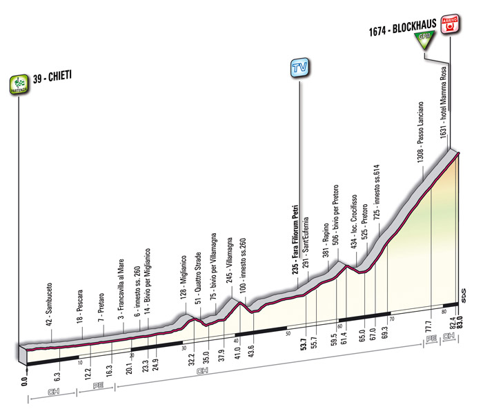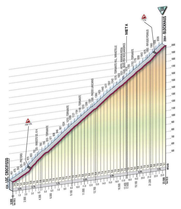 En la 8ª jornada regresa la media montaña, con una etapa junto a la costa del mar Adriático que incluye en su 2ª mitad el paso por el macizo del Gargano, con los puertos del Monte Sant´Angelo, Santa Tecla y Coppa del Fornaro antes del repecho final en Peschici, con 1,5 km a casi el 6% (los últimos 200 m al 10%), siendo un final propicio para “up-hill finishers”, con antecedentes en el año 2000 -> clasificación, con victoria de Di Luca; 2006 -> clasificación, con triunfo de Pellizotti; y 2008, con victoria de Priamo y liderato para Visconti. Al día siguiente, una etapa clave, sin grandes dificultades durante los primeros 85 km … pero con final en plenos Abruzzos, en el ascenso más duro de esta edición: el Blockhaus oeste (cota 1660 m), vertiente inédita como subida desde 1973 -> vídeo, y en la que destaca el tramo pasado el pueblo de Roccamorice, con 13,6 km finales al 8,4%  hasta llegar a meta, poco después del hotel Mamma Rosa, acumulando desde Scafa más de 1600 m de desnivel y 380 de coef. APM. Un auténtico coloso, entre los puertos más exigentes en carrera y que pese al poco desgaste previo puede provocar grandes diferencias en meta, con los favoritos que no tengan un buen día perdiendo buena parte de sus opciones en la general.