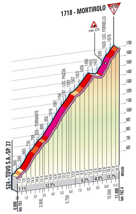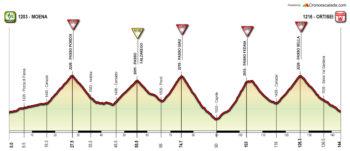 Volviendo al recorrido del próximo Giro, la etapa 17ª, entre Tirano y Canazei, rondará de nuevo los 220 km, con el encadenado de Aprica por Stazzona, con 11 km a casi el 7%, y Passo Tonale, acumulando desde Edolo 1200 m de desnivel, antes de un largo tramo favorable previo a Giovo, irregular pero con tramos duros, para un total de 6 km al 6,8%, y coronándose a 82 km de meta, con la particularidad de que no hay bajada sino un terreno casi siempre ascendente hasta meta, aunque salvo Cavalese por Castello de Fiemme (3,7 km al 5-6%) son falsos llanos, siendo probable que la etapa queda para escapadas, si bien el kilometraje, unido al desgaste camino de Bormio, puede provocar sorpresas. Al día siguiente, etapa dolomítica, de sólo 137 km pero incluyendo el famoso Passo Pordoi, con 12 km al 6,6%; Passo Valparola, de dureza muy similar; y el Passo Gardena, también con pendientes del 6-7% pero algo más corto (sin contar el falso llano previo), antes de un largo descenso en dirección a Ponte Gardena, aunque interrumpido por la trampa del Passo Pinei, con puntas del 15%, y cuya bajada dará paso a la subida a Ortisei, con un tramo de 3 km al 9,7% antes de la pancarta en Pontives, aunque la subida continúa, ya con pendientes más suaves, hasta casi la línea de meta, con el final sobre pavé.