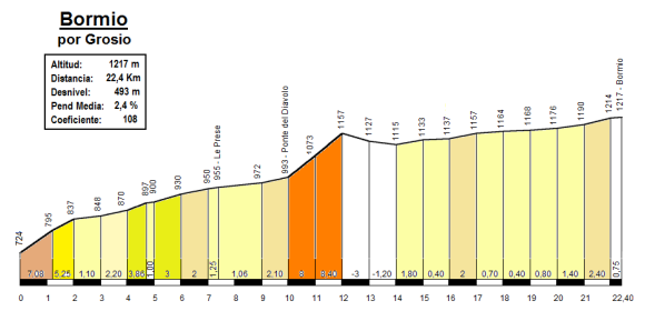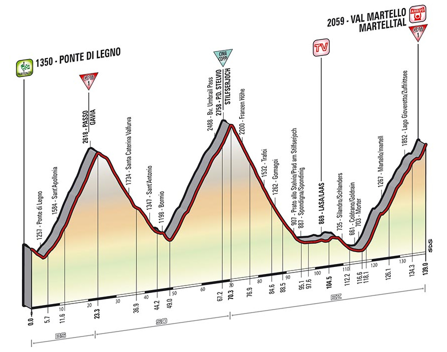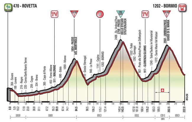 Como inicio de la 3ª semana, la etapa reina, con un recorrido de alta montaña que incluye en los últimos 150 km el Passo del Mortirolo, aunque no por su vertiente habitual sino subido por donde se suele bajar, siendo de todos modos muy exigente, con 12,6 km finales al 7,6%, y teniendo además un complicado descenso hacia Grosio; una zona traicionera entre esa localidad y Bormio, con 2 repechos duros; el mítico Passo dello Stelvio -> perfil oficial, con unas cifras totales de casi 22 km al 7,2%, siendo de nuevo Cima Coppi gracias a sus 2758 m de altitud; y tras espectacular descenso, con hasta 48 “tornantis”, y un tramo llano de 10 km el encadenado de Sª.María in Müstair (hasta el km 13,8 del perfil) y el inédito Pass Umbrail, frontera entre Suiza e Italia y desde 2015 completamente asfaltado, con 13,5 km al 8,4% desde el cruce, para un coeficiente de 360 APM si se incluye Santa María. Una vez coronado, a 20 km de meta, descenso hacia Bormio por la vertiente utilizada antes como subida, con algunas zonas muy reviradas pero la carretera en perfecto estado. Una jornada durísima, tanto por orografía, con 5400 m de desnivel acumulado, como por kilometraje, estando al nivel de las etapas más duras de la historia y pudiendo provocar grandes diferencias a poco que haya batalla. Eso sí, ojo a las condiciones meteorológicas, que en caso de nevada pondrían en peligro la etapa.