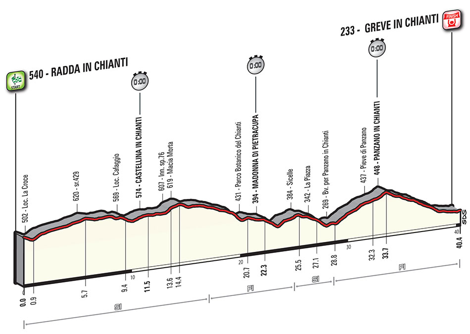 Al día siguiente, después de un largo traslado a Florencia, etapa de media montaña que rinde homenaje al gran Gino Bartali (nacido en la capital de La Toscana), afrontando de salida Passo della Consuma, con casi 1000 m desnivel, y el Passo della Calla, con 11 km finales al 6%, para tras su descenso, muy revirado, encarar el Passo del Carnaio (que sustituye al anunciado Sella di Raggio), muy irregular pero con zonas exigentes, antes del primer paso por Bagno di Romana, donde se iniciará un largo bucle con el encadenado Montecoronaro + Monte Fumaiolo, subida inédita donde destacan los 3 km finales, al 8,5%, y coronándose a unos 25 km de la llegada, la mayoría de descenso, incluyendo un primer tramo bastante complicado, pero con un repecho a mitad de bajada y 3,5 km llanos antes de meta. Una etapa muy interesante, tanto por el recorrido, con puertos ya desde el inicio y muy poco respiro a lo largo de la ruta, como por su colocación, con el desgaste de la crono pudiendo provocar sorpresas, aunque habrá que ver si los favoritos a la general se implican o queda como un día para escapadas consentidas.