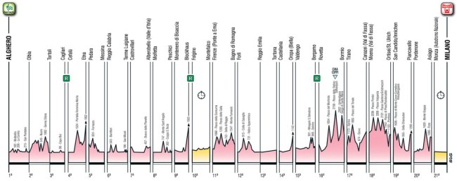 Después de 7 etapas de montaña consecutivas, el broche final lo pondrá una crono llana de 30 km, con salida desde Monza, incluyendo una vuelta completa al circuito, antes de dirigirse a la capital de la Lombardía, con la meta en la preciosa “Piazza del Duomo” de Milán, junto a la Catedral, siendo una CRI muy propicia para los especialistas, ya que además del perfil plano, incluso con ligera tendencia favorable, hay largas rectas a partir del km 10, siendo un terreno perfecto para mover grandes desarrollos, si bien el desgaste de la montaña se puede notar, como ocurrió en las contrarreloj finales de 2011 (se redujo a 26 km) y 2012, también en Milán y de kilometrajes muy similares, aunque teniendo un recorrido más técnico, imponiéndose Millar y Pinotti respectivamente, habiendo importantes cambios en la general en el último caso, con Hesjedal arrebatándole la maglia rosa a “Purito” y De Gendt alcanzando el podio en detrimento de Scarponi.
