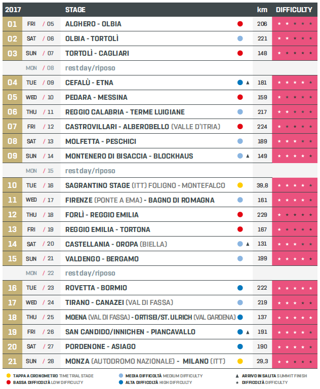 Por otro lado, también llama la atención la distribución de las etapas a priori claves, empezando bastante fuerte, con una dura jornada el 4º día, en Sicilia, acabando en el Etna, y el exigente final en el Blockhaus en el 9º, aunque en una etapa básicamente unipuerto; una 2ª semana que si bien también comienza con etapas importantes, con la CRI larga y la mencionada etapa de Bagno di Romana, después tiene varios días de transición y un fin de semana más flojo de lo esperado; y una última semana donde se concentra la dureza, con casi toda la alta montaña, incluída la impresionante etapa de Bormio, donde debido a la altitud de los puertos las condiciones meteorológicas serán un factor clave, aunque terminando la prueba con una contrarreloj, algo que no sucedía desde la edición de 2012, también en Milán, no habiendo de hecho ni una sola etapa llana en los últimos 8 días de carrera.