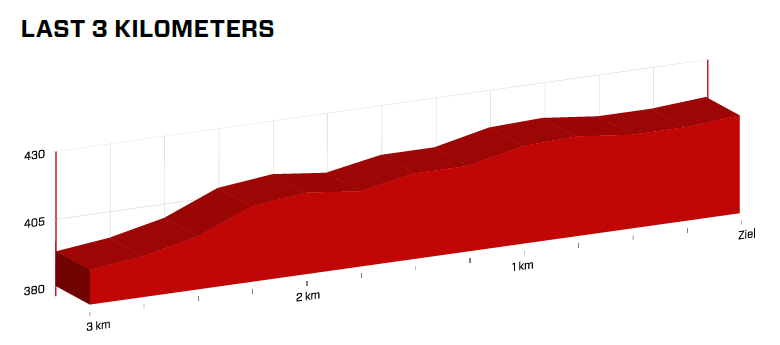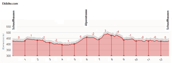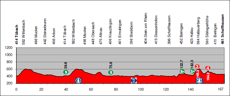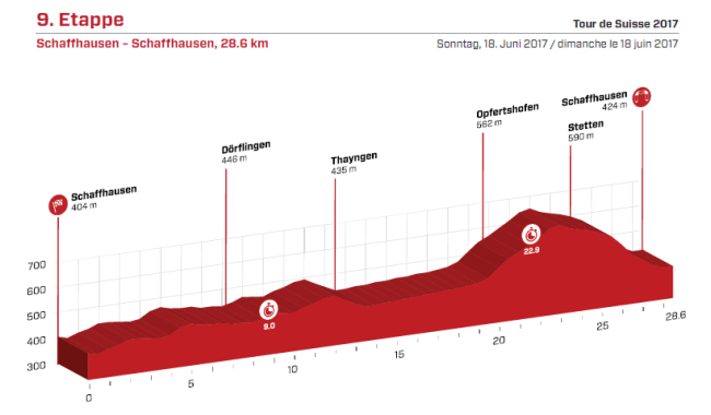El penúltimo día de carrera, después de un largo traslado desde Solden hasta Schafhaussen, en el extremo norte de Suiza, turno para la etapa más corta de esta edición, con apenas 100 km, teniendo que dar 8 vueltas a un circuito de 12,5 km que incluye la cota de Alpenstrasse, si bien es una subida de escasa dureza, con 1 km al 6%, por lo que en condiciones normales no debería haber cambios en la general, aunque ojo a posibles caídas, sobre todo si llueve. Y como despedida, una crono individual de 28,6 km, también con salida y llegada en Schafhaussen, teniendo los 2/3 iniciales básicamente llanos (aunque con algunos repechos tendidos), pero incluyendo en la parte final la cota de Opfertshofner, con 3,7 al 5% de media y coronándose a menos de 6 km de meta, la mayoría de descenso. Una CRI favorable para rodadores completos, pudiendo haber vuelcos en la general si la clasificación llega apretada… como ya ocurrió en la crono de 2011, donde Leipheimer, que partía 4º, acabó haciéndose con la victoria, superando a Cunego por 4 segundos, si bien era un poco más larga que la de este año.