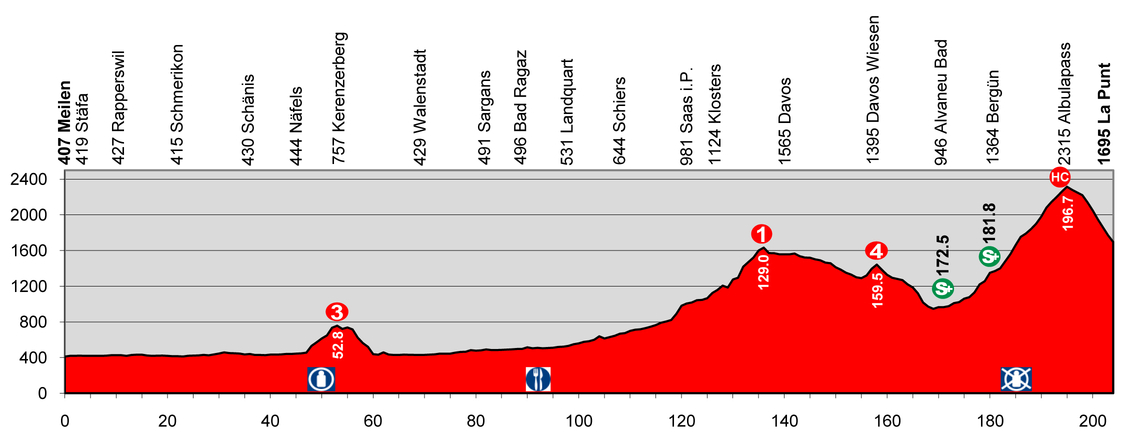 - Albulapass, HC (km 157,4): 2.315 m – 17,4 km – 6,9 % *sin contar falso llano previo