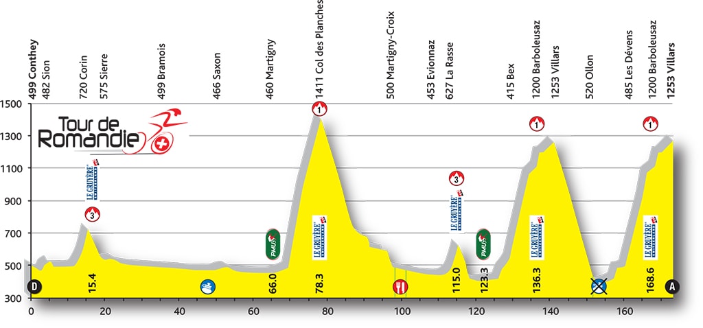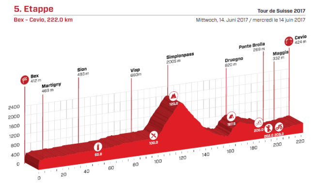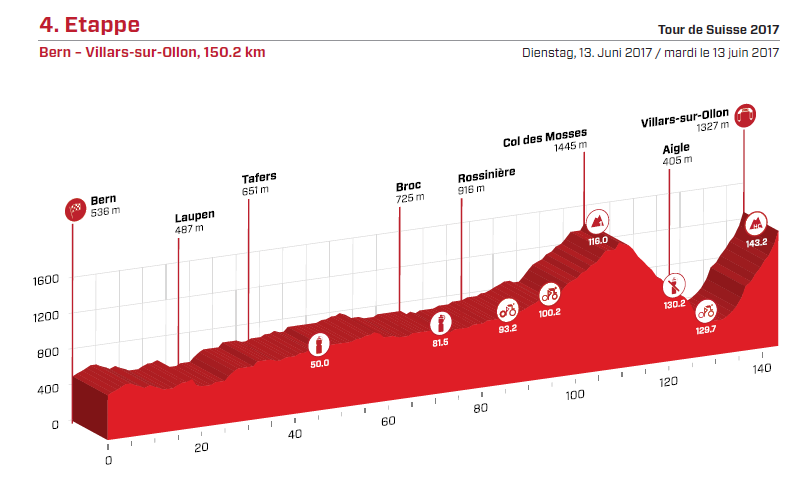 En la 4ª jornada llegará la 1ª etapa de alta montaña, con sólo 2 puertos pero situados en la parte final: el irregular Col des Mosses, con varias zonas al 6-7% separadas por descansillos, y tras su fuerte descenso y el paso por Aigle la subida final a Villars sur Ollon, con algo más de 11 km al 7,6% de media, incluyendo largos tramos al 9-10%, pudiendo hacer bastante daño si se sube a tope desde abajo, aunque existía la opción de haber realizado un doble paso. Esta localidad, situada a 8 km de la cima del Col de la Croix, se ha convertido en un clásico del Tour de Romandía, siendo tanto puerto de paso como llegada, aunque subiendo por la vertiente sur, más blanda, con triunfo de Froome en 2016. Al día siguiente, etapa de 220 km entre Bex y la población de Cevio, en el cantón de Ticino, incluyendo a mitad de la ruta el Simplonpass, con 20 km de ascensión, para tras su larga bajada entrar en Italia y afrontar Druogno, con 8 km superando el 6% de media, regresando poco después a Suiza, con una parte final de la etapa básicamente llana. En resumen, un día favorable para las escapadas pero sin que tampoco se pueda descartar un sprint reducido.