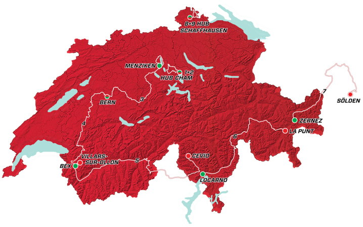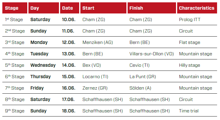 Así pues, la carrera se inicia con una crono individual de 6 km en torno a la localidad de Cham, junto al lago Zug, en la zona centro-norte de Suiza, teniendo un trazado básicamente llano y con escasas curvas, siendo muy favorable para los especialistas. Al día siguiente, 1ª etapa en línea, también con salida y llegada en esta localidad, en este caso con un circuito de 43,5 km al que los corredores tendrán que dar 4 vueltas, incluyendo como mayor dificultad orográfica el muro de Horen, con algo más de 2 km al 11%, si bien coronándose por última vez a 23 km de meta, siendo un día propicio para los velocistas que pasan bien la media montaña. La 3ª jornada unirá la población de Menziken, en el cantón de Argovia, con Berna, la capital «de facto» del país, incluyendo a lo largo de la ruta varias pequeñas cotas, con la última de ellas, Aargauerstalden (0,9 km al 6-7%), coronándose a sólo 600 m de la llegada, por lo que aún siendo una subida modesta resultará clave para la resolución de la etapa, siendo de nuevo una etapa propicia para los clasicómanos.