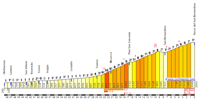 - Passo San Bernardino, HC (km 67,5): 2.066 m – 27 km – 5,8 %