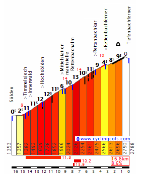 - Tiefenbachferner, HC (km 106,2): 2.830 m – 14,6 km – 10 %