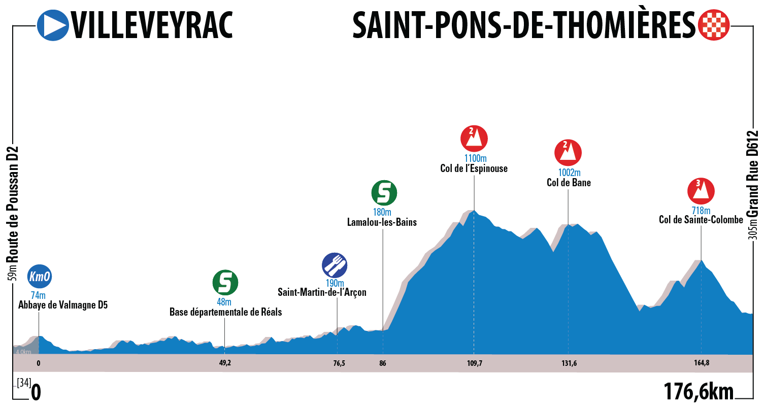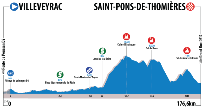 1ª ETAPA (Jueves 15 junio): VILLEVEYRAC – SAINT PONS DE THOMIERES (176,6 km). Rutómetro y horarios / Mapa salida y llegada