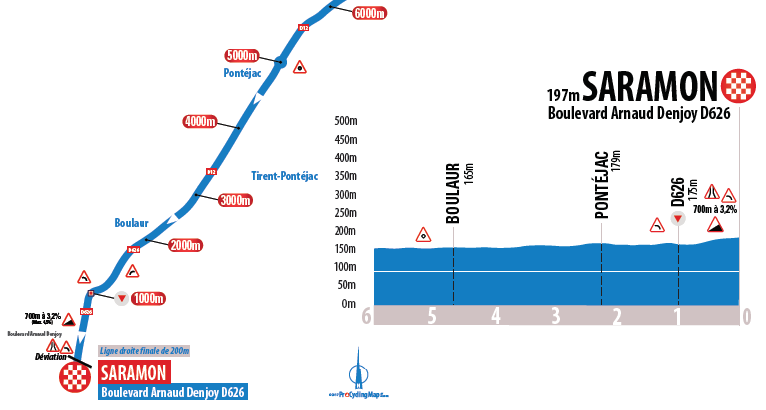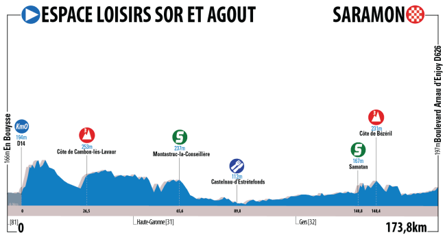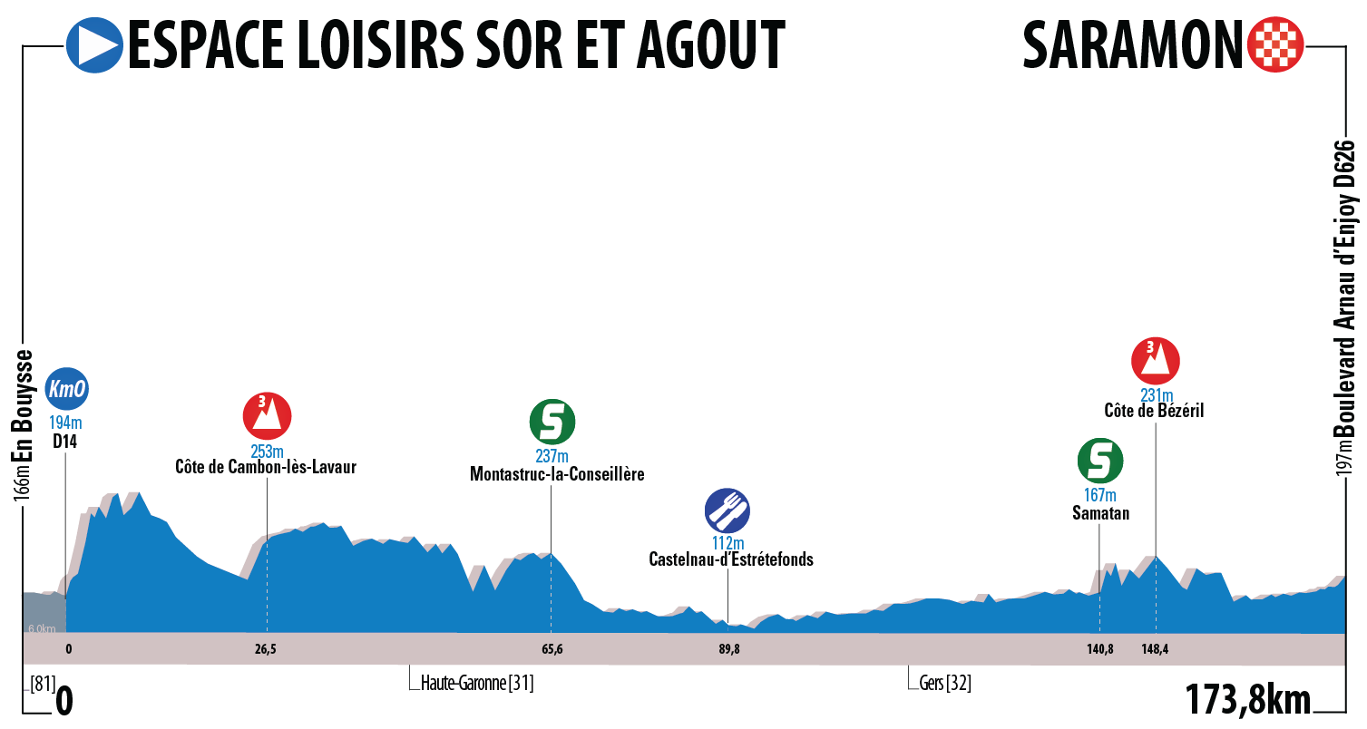 Así pues, la carrera se iniciará con la mencionada jornada de media montaña de Villeveyrac, con una 1ª mitad de la ruta muy llana pero con 90 km finales de sube y baja constante, circulando además por carreteras secundarias, incluyendo los puertos de Espinouse, Bane y Sainte Colombe antes de la meta en Saint Pons de Thomiéres (inicio de la Ruta del Sur 2016). Una etapa que puede dar mucho juego, con terreno para escapadas e incluso posibilidades de fuga-bidón si ningún equipo quiere controlar en el pelotón. La 2ª etapa unirá de Sort et Agout, en el departamento de Tarn, con la pequeña localidad de Saramon, en el departamento de Gers, con una ruta en general llana aunque con algunas zonas de repechos, la última a 20-30 km de meta, incluyendo la modesta cota de Bezeril, aunque eso sí, ojo también al final, picando hacia arriba con 700 m al 3,2%, siendo una llegada para corredores de fuerza.