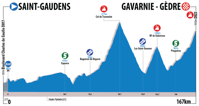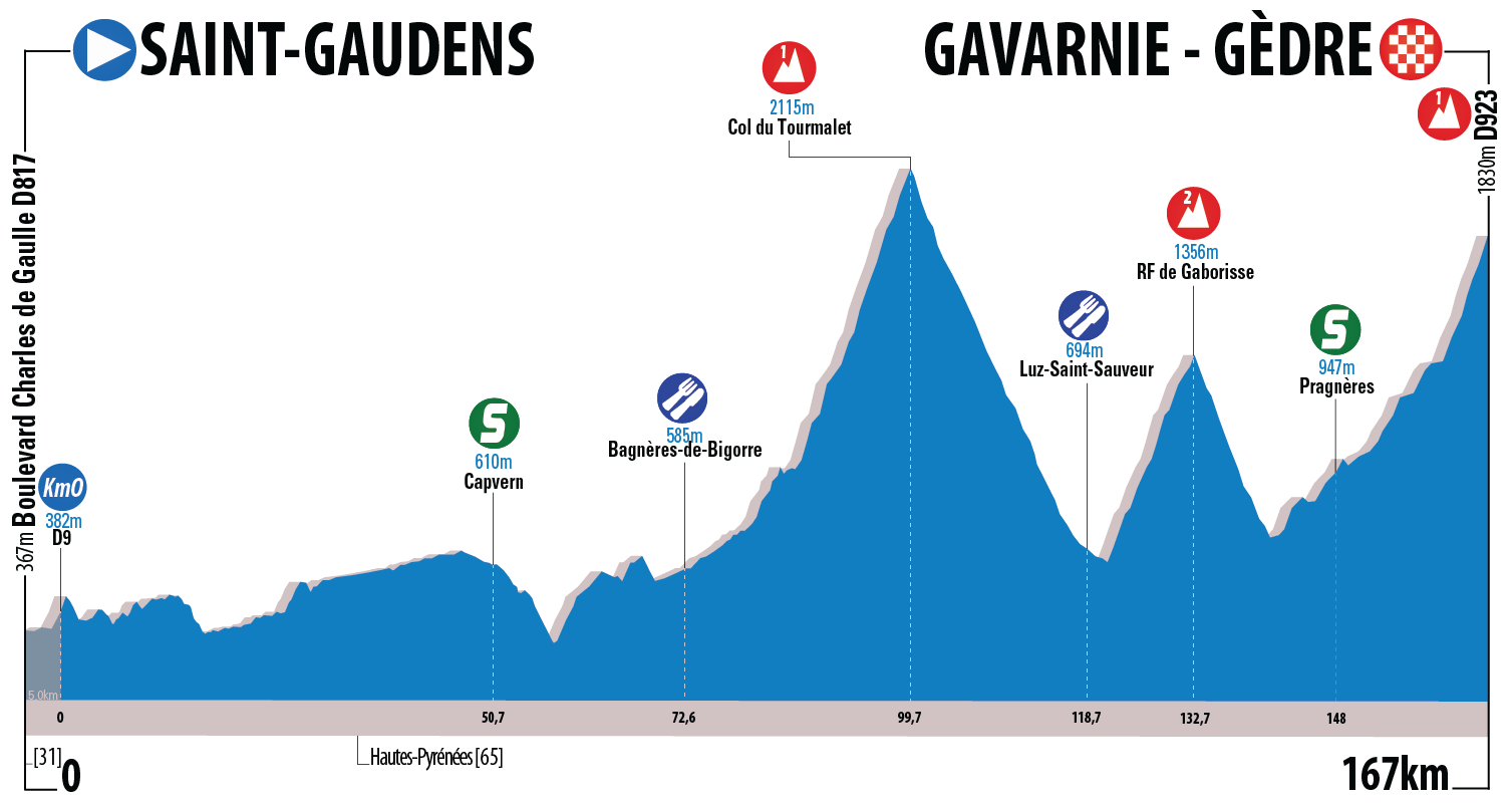 En la 3ª jornada será el turno para la etapa reina, con casi 170 km entre Saint Gaudens y la estación de esquí de Gavarnie-Gedré, teniendo que superar previamente el clásico Col du Tourmalet, el puerto más transitado en la historia en el Tour y por esta vertiente con 13 km finales al 8,5% de media, estando entre los puertos más duros, y tras su largo descenso la subida a Luz Ardiden por la inédita vertiente de Viscos, nombrada oficialmente Gaborisse y que cuenta con 10,2 km al 7,8% hasta el cruce con la vert. tradicional, que se utilizará como bajada en busca del inicio de la larga subida final a la estación, que se puede dividir en 2 partes: 19 km al 3,6% de media (aunque muy irregulares) hasta pasada la localidad de Gavarnie, y los últimos 5,5 km al 8-9% hasta el parking de la estación. En definitiva, una etapa tan exigente, con grandes puertos de paso y una subida final muy «pajarera», como novedosa, estrenando por fin la vertiente N de Luz Ardiden, que de cara a próximas años podría dar mucho juego como puerto previo al Tourmalet oeste, y Gavarnie, aunque sin subir hasta arriba (Col des Tentes / Boucharo).