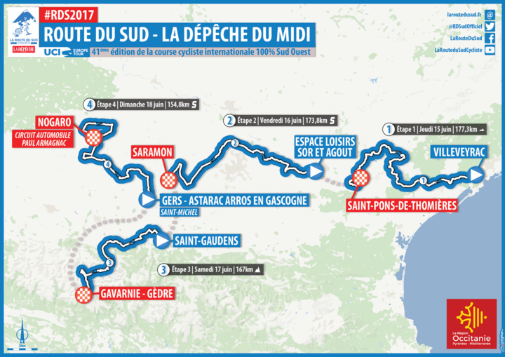 Del 15 al 18 de junio, coincidiendo con las etapas decisivas de la Vuelta a Suiza, se disputa la 41ª edición de la “Route du Sud”, carrera de la categoría 2.1 que tiene lugar en la región francesa de Midi-Pyrénées, al sur del país, teniendo este año varias noticias muy positivas, como la mejora en la participación, pasando a tener 7 equipos World Tour frente a los 3 del año pasado, con varios corredores buscando afinar su forma de cara al próximo Tour de Francia; un recorrido atractivo, destacando sobre todo la novedosa etapa reina: y manteniéndose la retransmisión en directo de la carrera, a través de Eurosport.