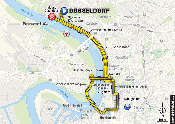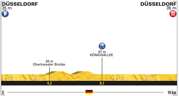 1ª ETAPA (Sábado 1 de Julio):  DÜSSELDORF – DÜSSELDORF  (CRI)  (14 km).  Info oficial / Últimos km