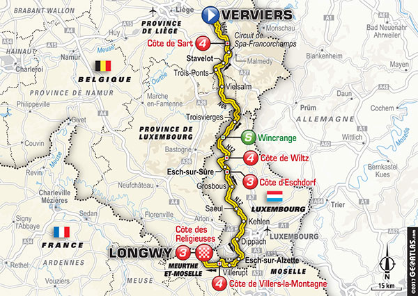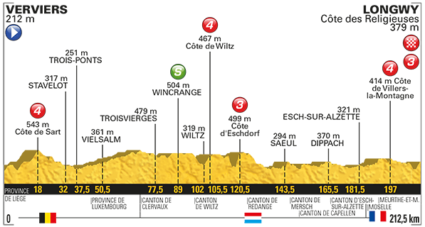 3ª ETAPA (Lunes 3 de Julio):  VERVIERS – LONGWY  (212,5 km).  Info oficial / Últimos km
