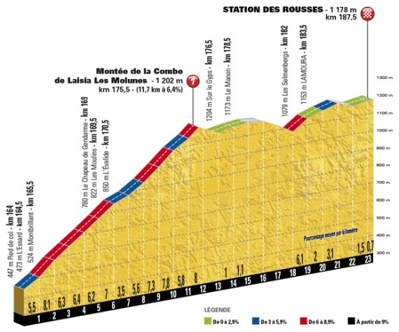 • Côte de Combe de Laisia-Les Molunes, 1ª (km 175,5):  1.202 m – 11,7 km – 6,4 %