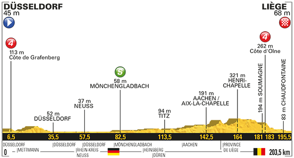 2ª ETAPA (Domingo 2 de Julio):  DÜSSELDORF – LIÈGE  (203,5 km).  Info oficial / Últimos km