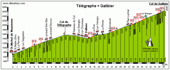 - Col du Galibier, HC (km 155): 2.642 m – 17,7 km – 6,9 %