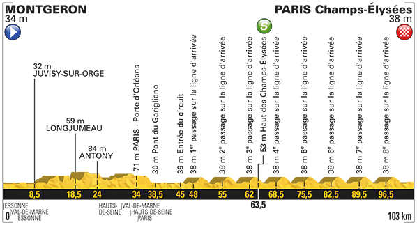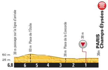 Como despedida de la prueba, después del largo traslado desde Marsella hasta París, la clásica etapa final con múltiples pasos por el circuito de los Campos Elíseos, en este caso estando programadas 8 vueltas completas, siendo una jornada totalmente favorable para los sprinters y que como es habitual servirá de homenaje para todos los ciclistas que hayan logrado aguantar las 3 semanas de carrera.