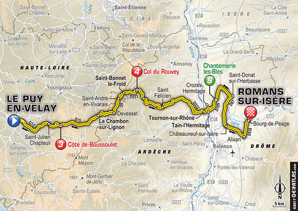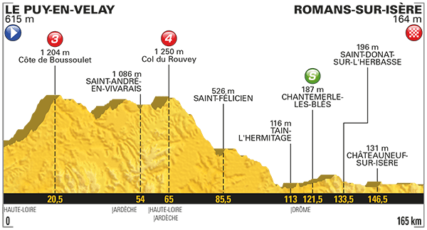 Después del día de descanso, la carrera prosigue con una jornada de 165 km entre las localidades de Le Puy en Velay, perteneciente a Haute Loire, y Romans sur Isère, en departamento de Drôme, con una ruta quebrada en su 1ª mitad, destacando el ascenso a Boussoulet, con un tramo de 4,5 km al 6-7%, pero llana en el último tramo, siendo propicia para los velocistas pero donde tampoco puede descartarse que triunfe una escapada, sobre todo si es numerosa. Y ojo a la posibilidad de abanicos, sobre todo en los últimos 60 km. Por otro lado, señalar que el ganador en Romans sur Isere será el 1º en lograrlo, ya que estrena como final de etapa en el Tour.
