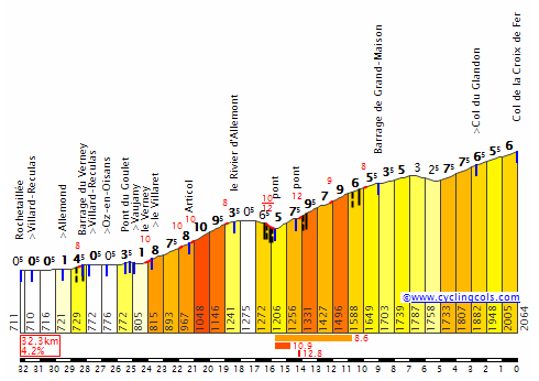 - Col de la Croix de Fer, HC (km 78,5): 2.067 m – 24 km – 5,2 %