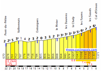 - Col du Rouvey (desde km 5), 4ª (km 65): 1.250 m – 2,8 km – 5,6 %