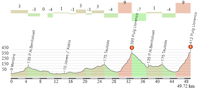 Antes del día de descanso, nuevo final en alto, en este caso “puro”, con llegada en Cumbre del Sol (Alto Puig Llorenca), en las cercanías de la localidad de Benitatxell, una subida tan irregular como exigente, con rampas de hasta el 20% seguidas por descansillos, para un total de 4 km al 9,5% de media (aunque oficialmente sería algo más blando). Anteriormente se habrá realizado un primer paso, si bien llegando sólo hasta la cota 350 m, quedando un ascenso de pendiente similar pero con casi un km menos, realizando después un largo rodeo (que se podría acortar en 25 km, además de subir por una variante más dura -> alternativa) antes de afrontar el 2º paso, siendo un recorrido casi idéntico al de 2015, cuando se estrenó esta llegada con victoria y liderato para Dumoulin -> clasificación / vídeo, cambiando sólo la salida: en aquella edición Torrevieja y este año Orihuela, localidad de nacimiento del poeta Miguel Hernández, al que se rendirá un merecido homenaje al cumplirse el 75 aniversario de su muerte.
