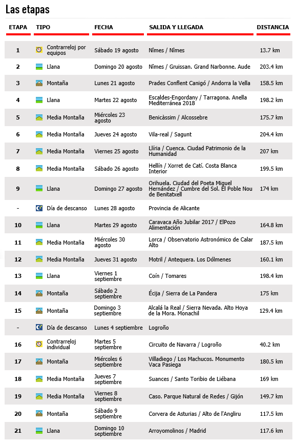 Durante las próximas 3 semanas, entre el sábado 19 agosto y el domingo 10 de septiembre, se disputa la 72ª edición de la Vuelta Ciclista a España, una de las tres grandes carreras por etapas, junto al Giro de Italia y el Tour de Francia. Y como es habitual en los últimos años, con una gran participación, incluyendo a 4 vencedores de grandes vueltas, Chris Froome, Alberto Contador, Vincenzo Nibali y Fabio Aru, además de otros corredores de mucho nivel: Romain Bardet, Esteban Chaves, Ilnur Zakarin, Rafal Majka, los hermanos Yates, Warren Barguil, Steven Kruijswijk, Miguel A. López, etc… aunque también hay ausencias importantes, como Nairo Quintana, Alejandro Valverde y Tom Dumoulin.