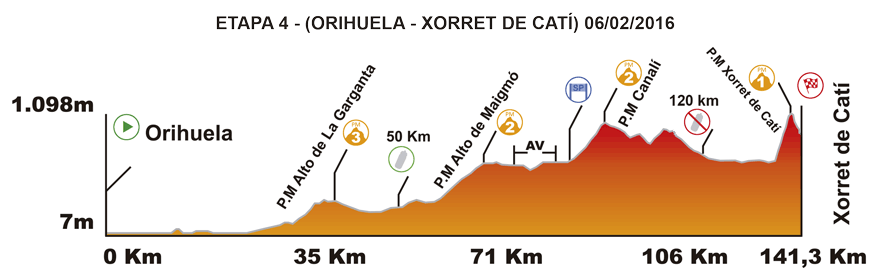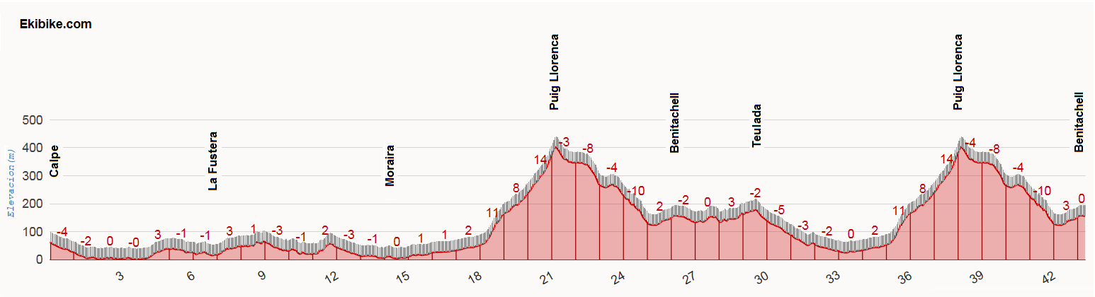 - Alto de Puig Llorenca / Cumbre del Sol, 1ª (Meta): 415 m – 4 km – 9,1 %