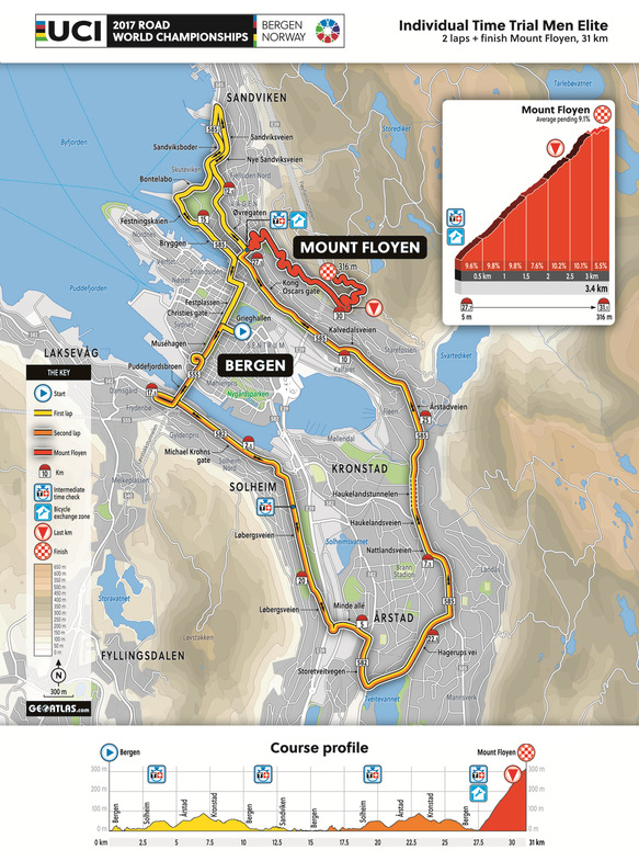 Anterioremente, los corredores tendrán que realizar una vuelta y media a un circuito de 16,1 km en torno a Bergen, el mismo de la CRI junior femenina y similar también al de la CRI élite, aunque con la diferencia de no incluir la cota de Birkelundsbakken, siendo los repechos de Solheim, con 600 m al 5-6%, y Arstad, con casi un km al 5%, las mayores dificultades orográficas, teniendo que superarse ambos en 2 ocasiones. Curiosamente, será justo en el 2º paso por la zona de pavé de Ovregaten, en el km 11,5 km de la 2ª vuelta, cuando tomen el desvío hacia el mencionado Monte Floyen, con unas cifras oficiales de 3,4 km al 9,1%. Un terreno muy distinto al resto de la CRI, por lo que los corredores cambiarán de bicicleta justo antes de empezar el ascenso.