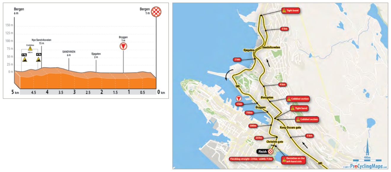 Coronado Salmon Hill, fuerte descenso, con varias curvas cerradas aunque por carretera ancha y bien asfaltada, hasta la vía principal, Landassvingen, destacando el paso por un túnel de casi 400 m antes de continuar la bajada hacia Bergen, con el tramo final del circuito básicamente llano, si bien incluyendo una zona de pavé de 600 m al paso por Ovregaten, a unos 4,5 km de la llegada, picando hacia arriba aunque con el pavé en buenas condiciones. Superado ese tramo, rodeo por Sandviken antes de volver hacia el sur, circulando junto a la costa, en busca de la llegada en Bergen, con la línea de meta de meta de nuevo situada en Festplassen, en el caso antiguo de la ciudad.