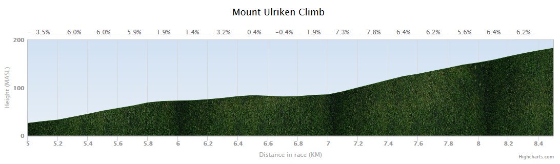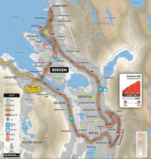 Como decíamos en el análisis de la prueba femenina, los primeros 2,5 km del circuito son básicamente llanos, incluyendo el paso por un túnel de 380 m seguido por un puente de casi medio km, pero a partir de Solheim la ruta se endurece, con el repecho homónimo, de 600 m al 5-6%, seguido por la cota de Arstad, con 900 m al 5%, que es el inicio de Salmon Hill, aunque el falso llano intermedio hace que solo cuenten el tramo final, con 1,5 km finales al 6,4% de media, para un total de 3,5 km al 4,5%, una longitud muy similar a la del Poggio, la última cota de la Milán-San Remo, si bien la pendiente de la subida noruega es superior, aumentando además su exigencia por los múltiples pasos.