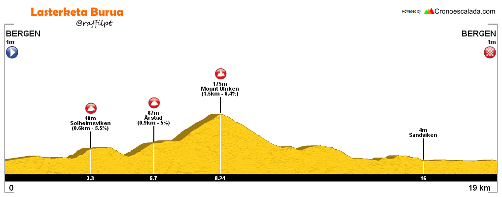 En definitiva, un recorrido exigente, sobre todo por el largo kilometraje, rozando los 270 km, pero en principio poco rompedor (si hace buen tiempo), echándose a priori en falta alguna cota más dura, por ejemplo Birkelundsbakken, con 800 m finales al 10%, incluída en la crono por equipos y que se hubiera encadenado perfecto con Salmon Hill, o menos rodeo final, para evitar reagrupamientos antes de meta. No obstante, a la hora de la verdad dependerá mucho de las condiciones meteorológicas, ya que si llueve, algo muy habitual en Bergen, y hay equipos con ganas de marcha la carrera puede convertirse en una escabechina, resultando más dura de lo que aparenta sobre el perfil.