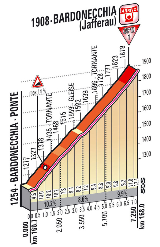 - 20ª etapa (sábado 26 mayo): Susa – Cervinia (214 km) -> mapa