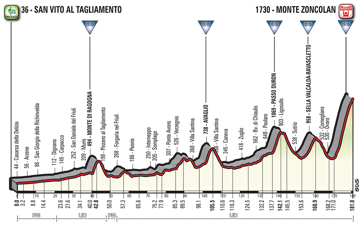 - 14ª etapa (sábado 19 mayo): San Vito al Tagliamento – Monte Zoncolan (181 km) -> mapa